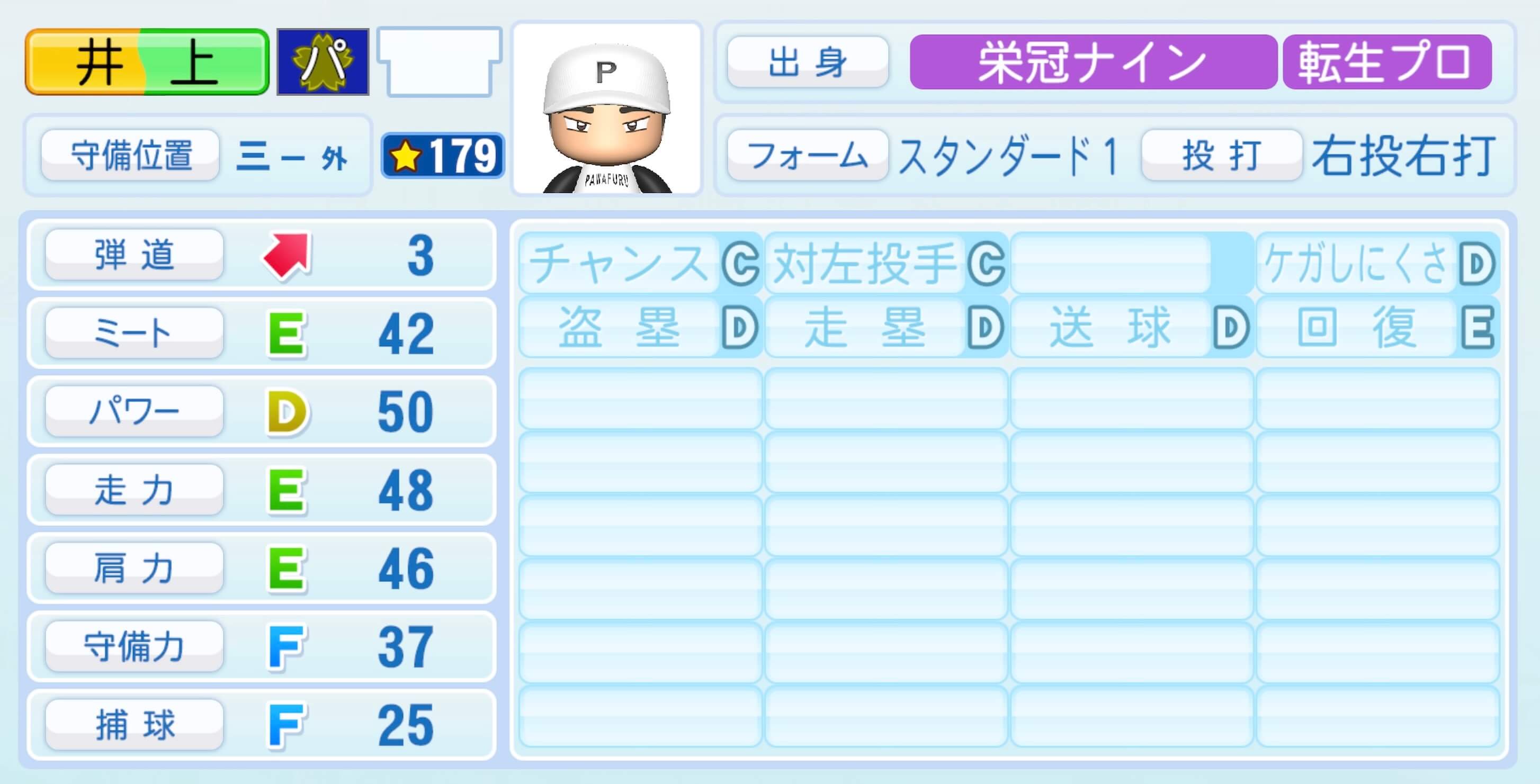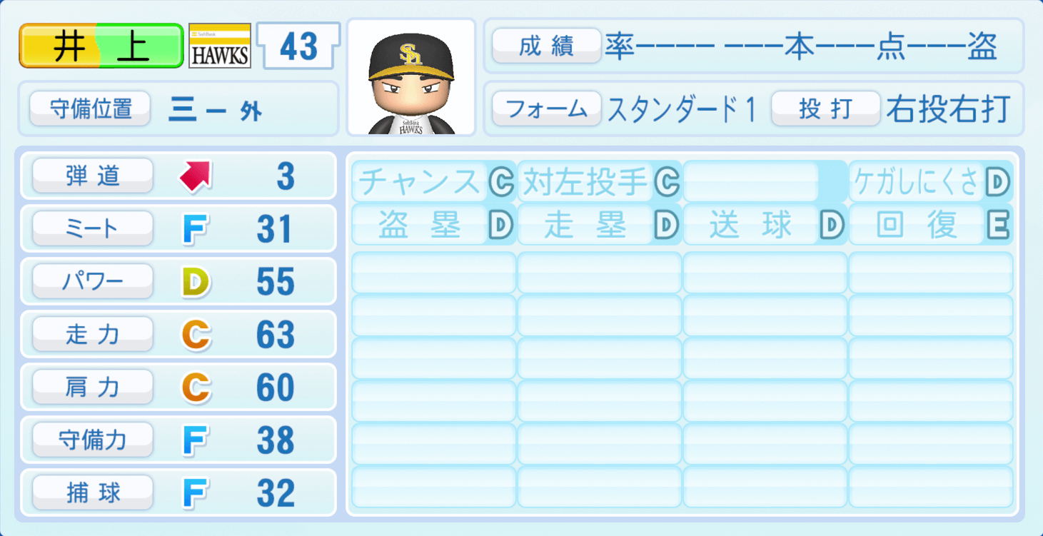 | 守備位置 | 弾道 | ミー | パワ | 走力 | 肩力 | 守備 | 捕球 |