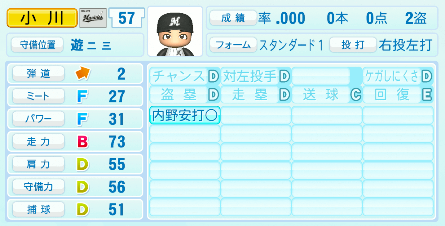 | 守備位置 | 弾道 | ミー | パワ | 走力 | 肩力 | 守備 | 捕球 |