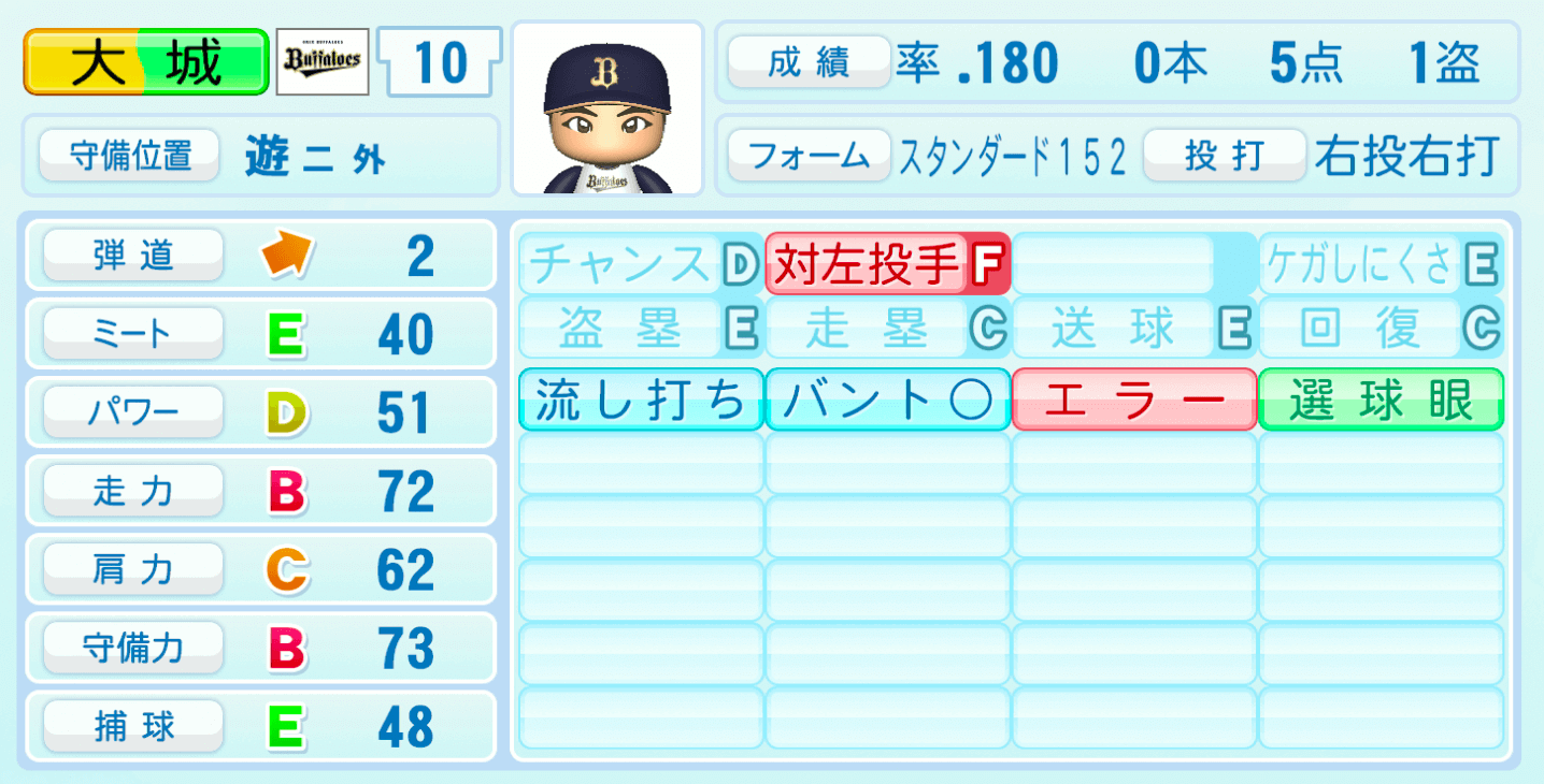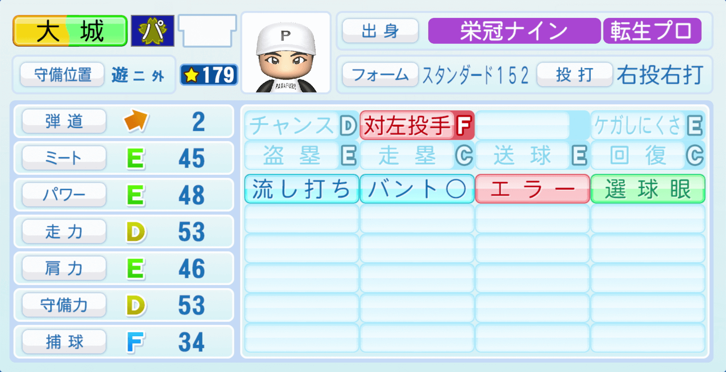 | 守備位置 | 弾道 | ミー | パワ | 走力 | 肩力 | 守備 | 捕球 |