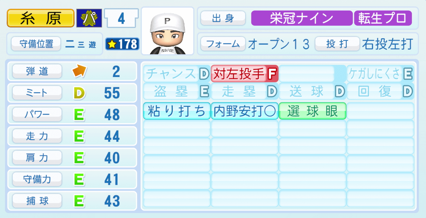 | 守備位置 | 弾道 | ミー | パワ | 走力 | 肩力 | 守備 | 捕球 |