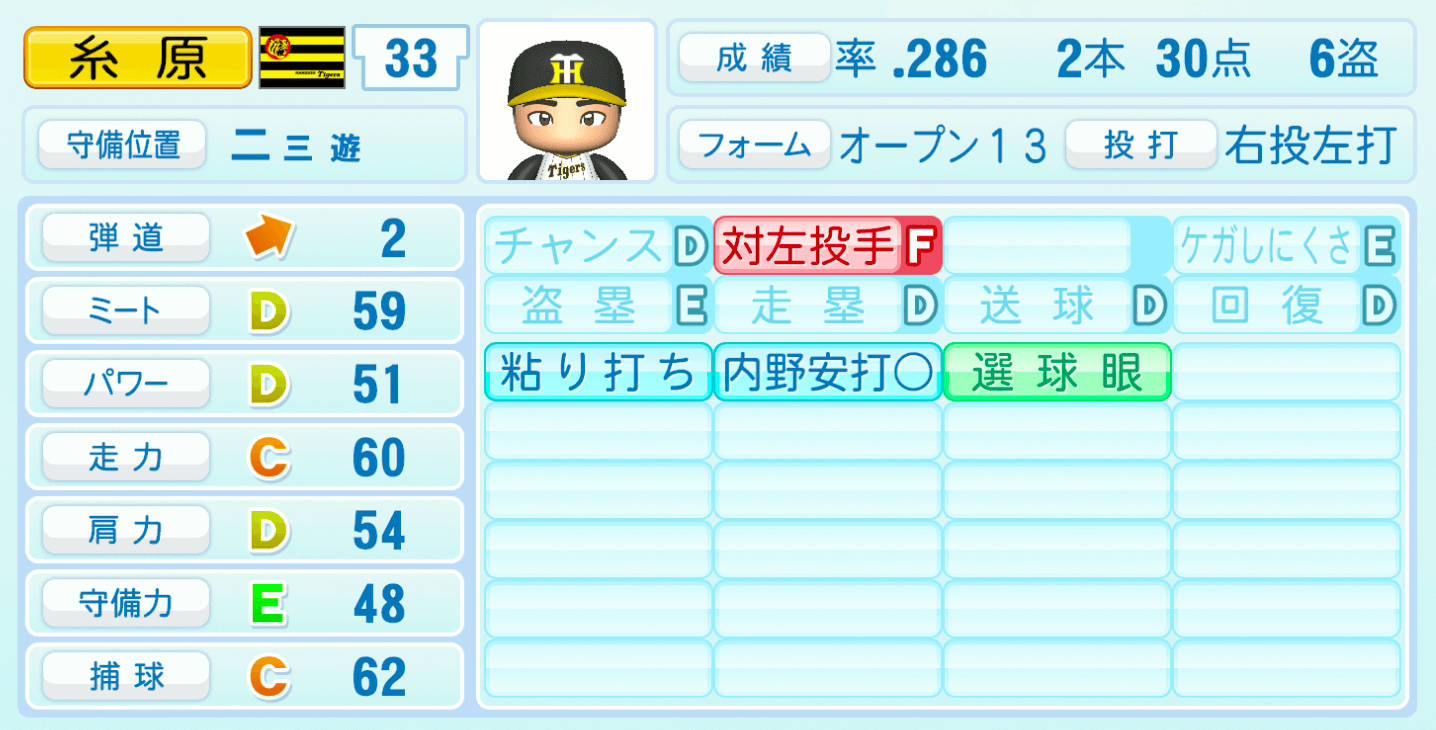 【パワプロ2022】糸原健斗の選手・特殊能力と転生情報|阪神