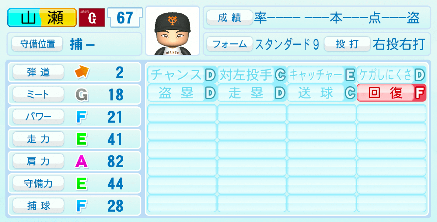 | 守備位置 | 弾道 | ミー | パワ | 走力 | 肩力 | 守備 | 捕球 |