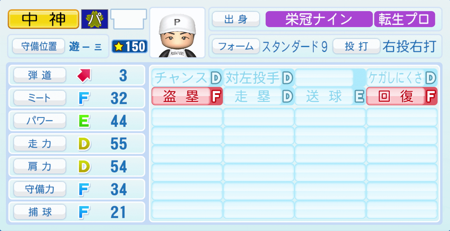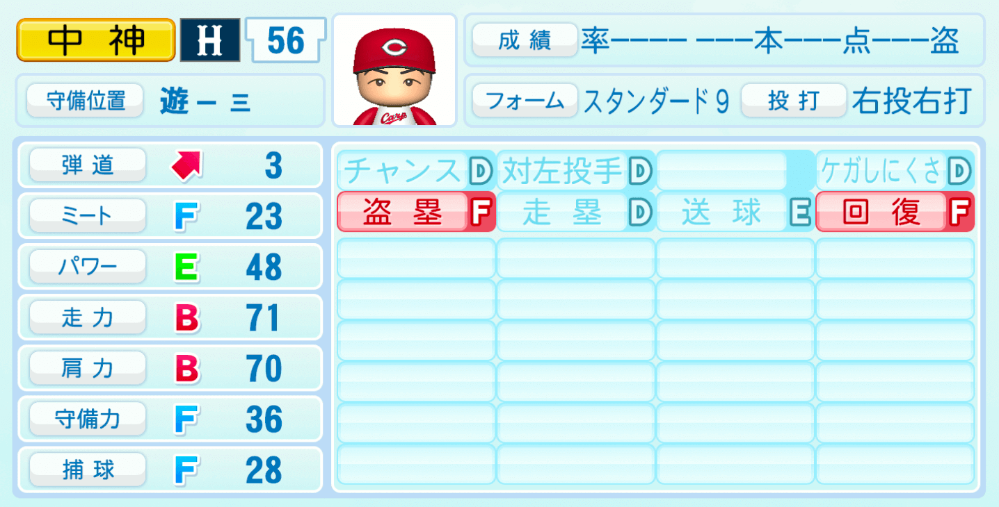 | 守備位置 | 弾道 | ミー | パワ | 走力 | 肩力 | 守備 | 捕球 |