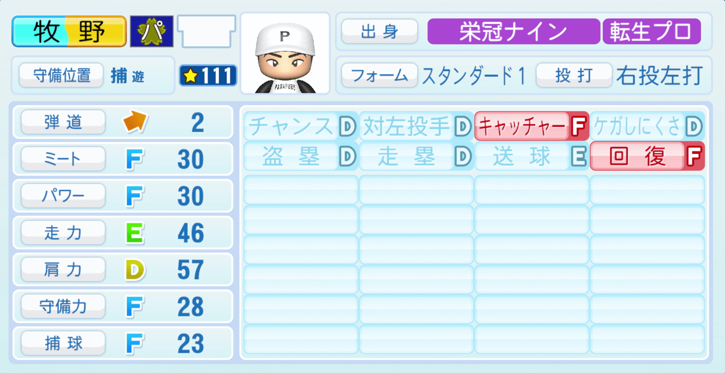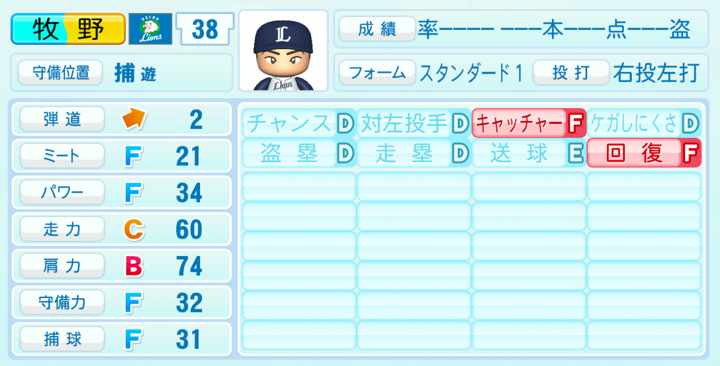 | 守備位置 | 弾道 | ミー | パワ | 走力 | 肩力 | 守備 | 捕球 |