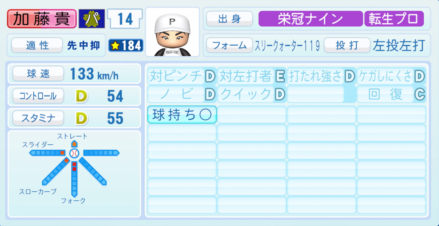 | 適性 | 先/中 | 球速 | 143km/h |