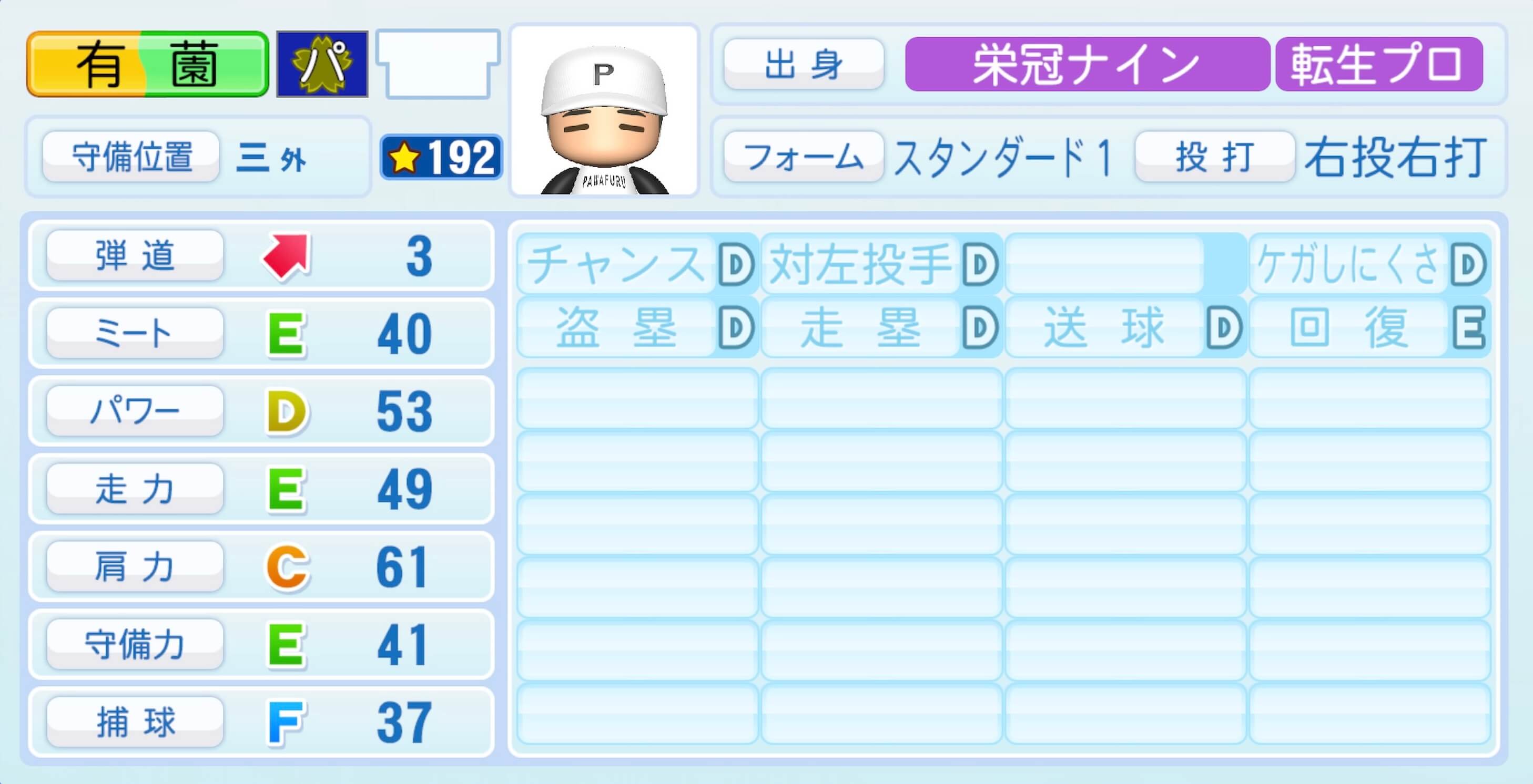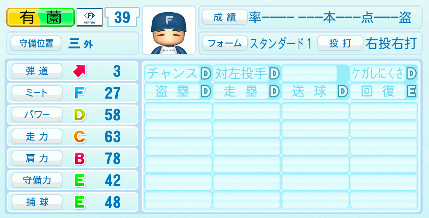 | 守備位置 | 弾道 | ミー | パワ | 走力 | 肩力 | 守備 | 捕球 |