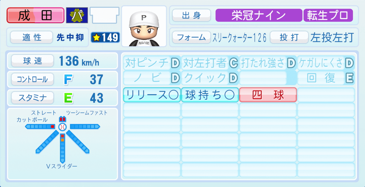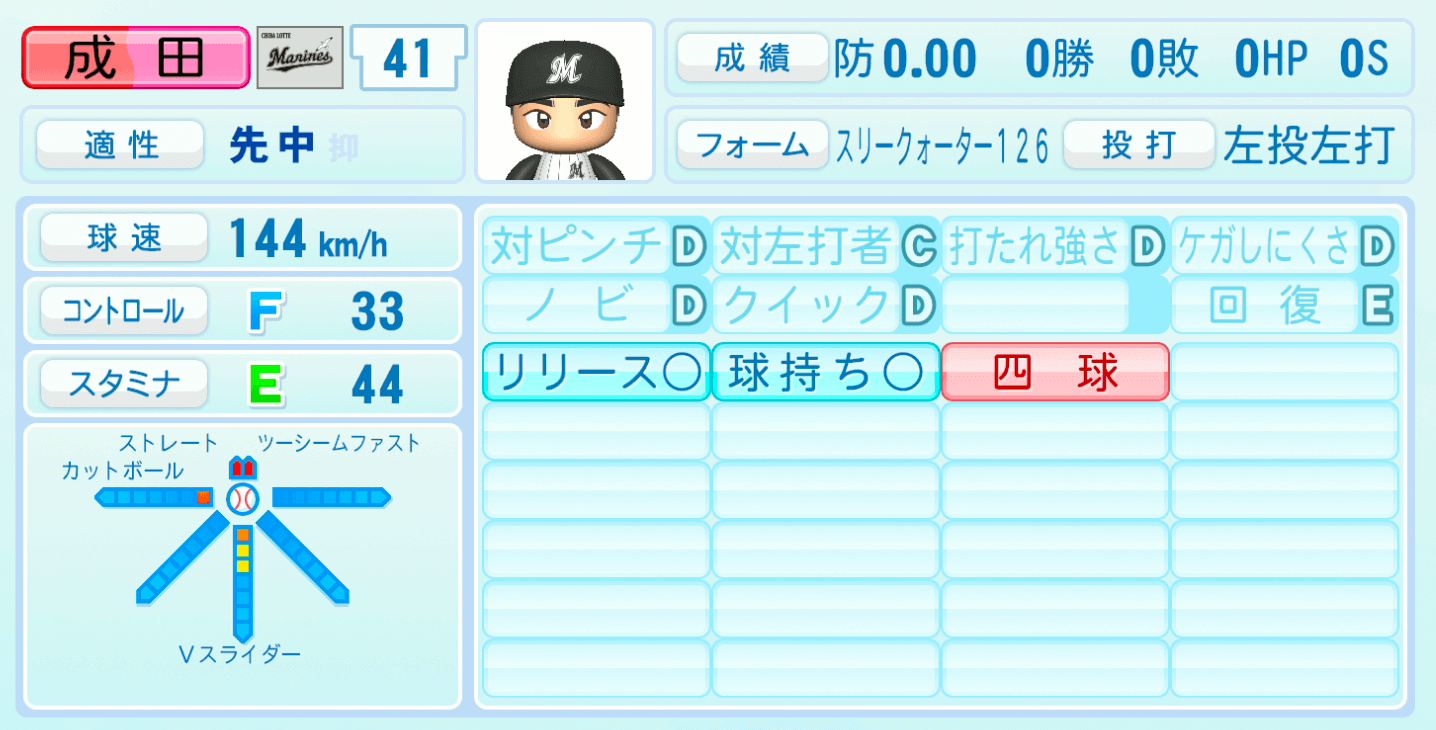 | 適性 | 先中/- | 球速 | 144km/h |
