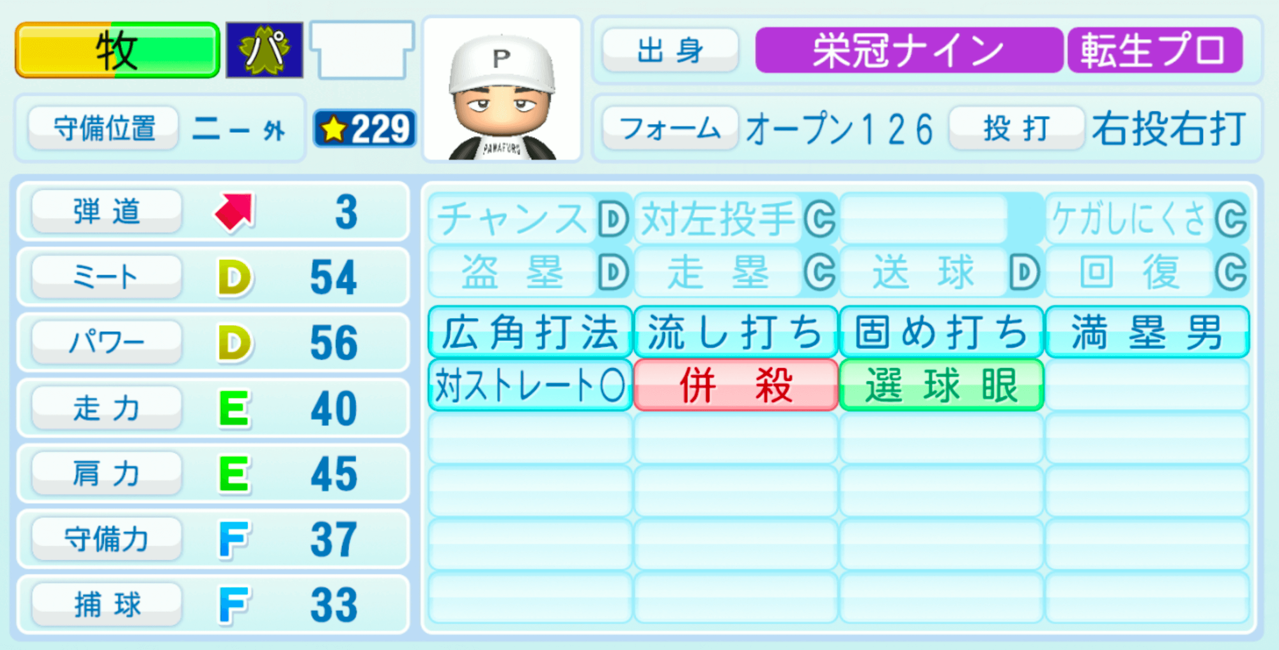 | 守備位置 | 弾道 | ミー | パワ | 走力 | 肩力 | 守備 | 捕球 |
