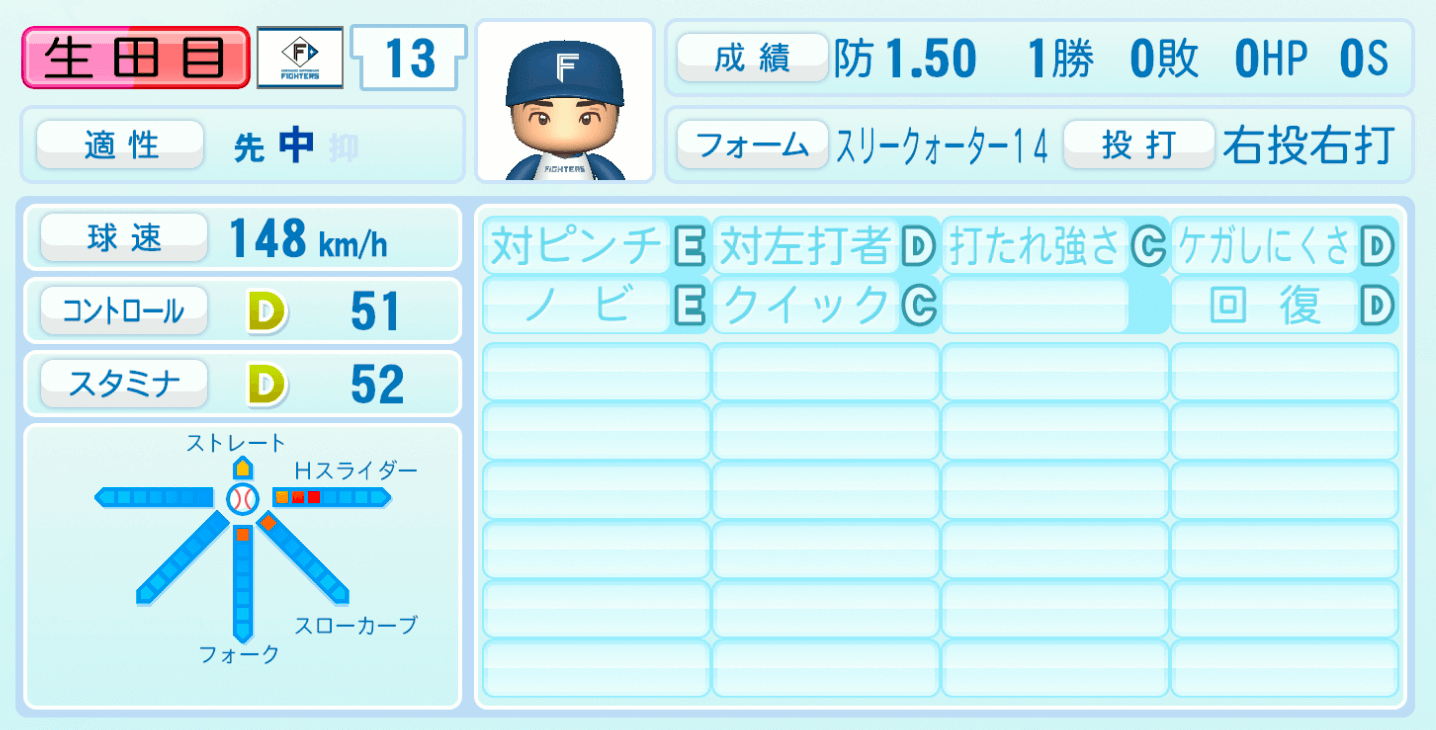 | 適性 | 中/先 | 球速 | 148km/h |