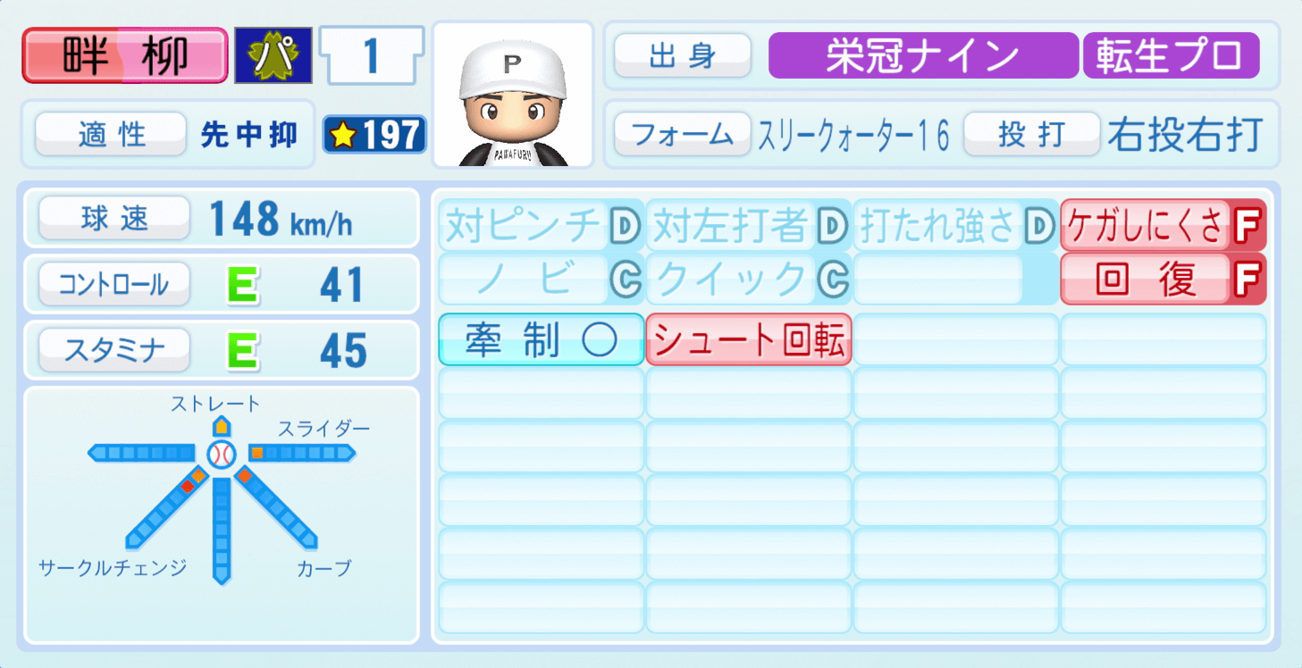 | 守備位置 | 弾道 | ミー | パワ | 走力 | 肩力 | 守備 | 捕球 |