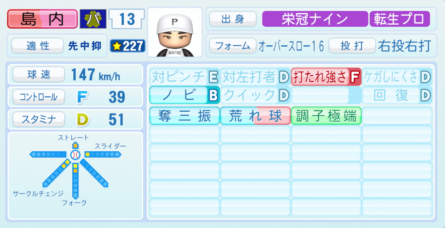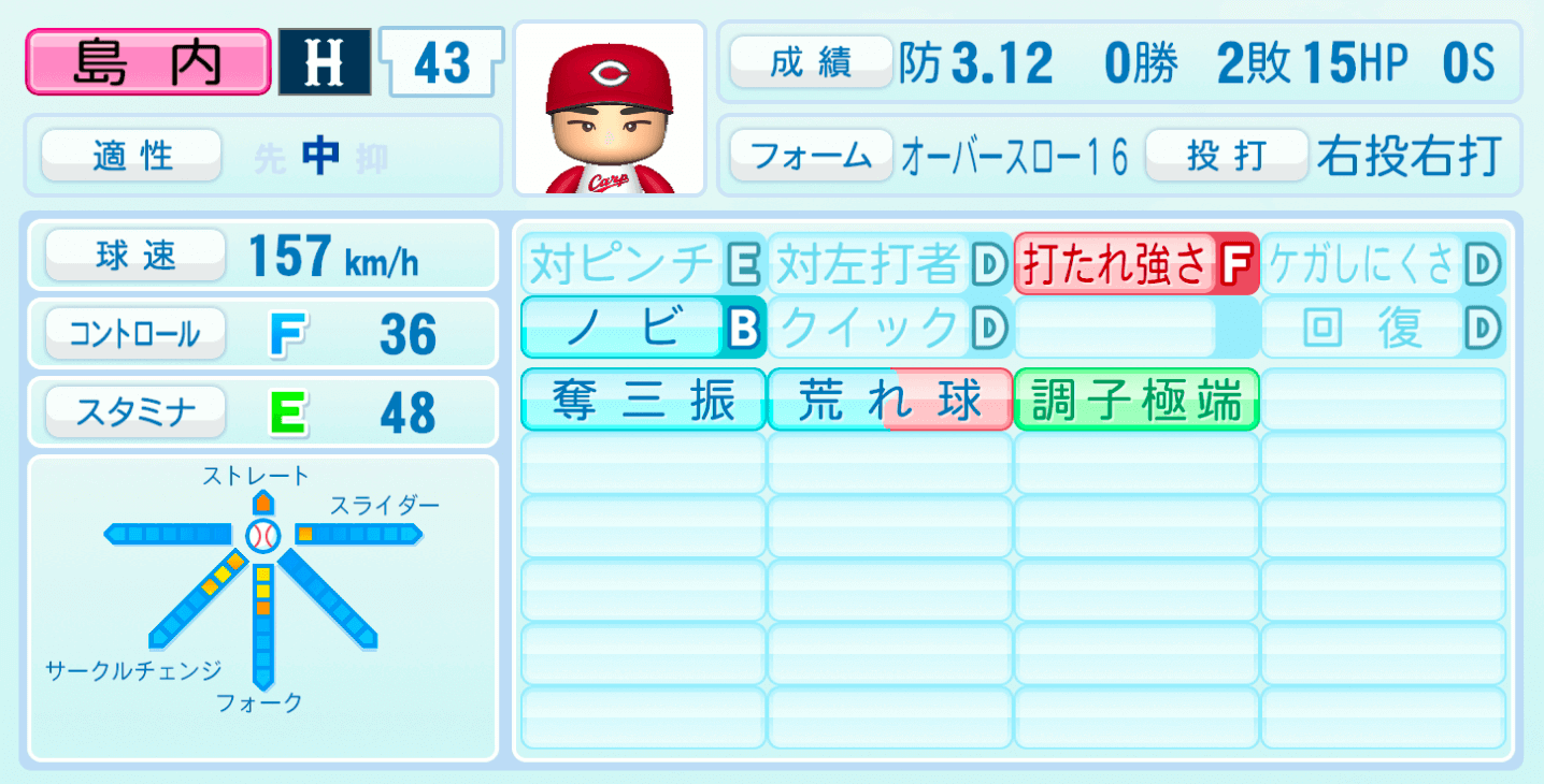 | 適性 | 中/- | 球速 | 157km/h |