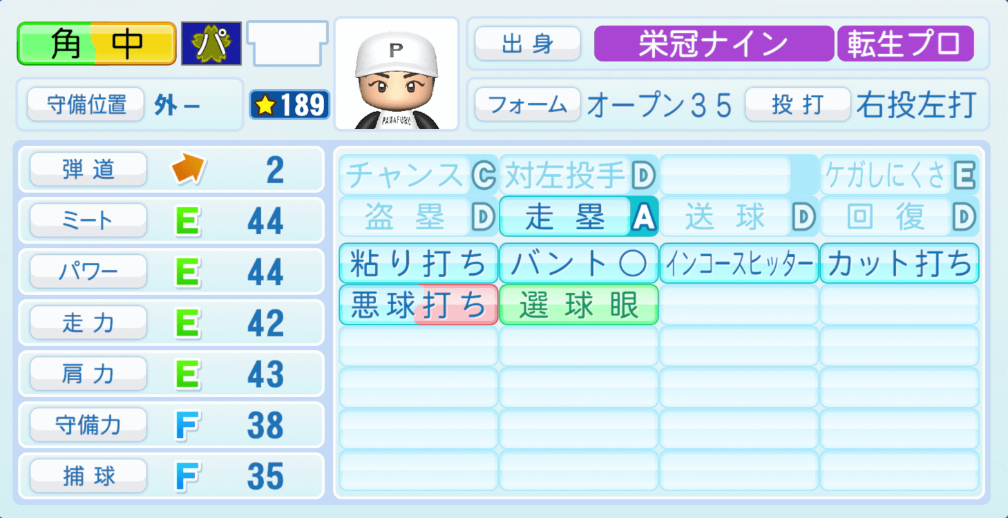 | 守備位置 | 弾道 | ミー | パワ | 走力 | 肩力 | 守備 | 捕球 |