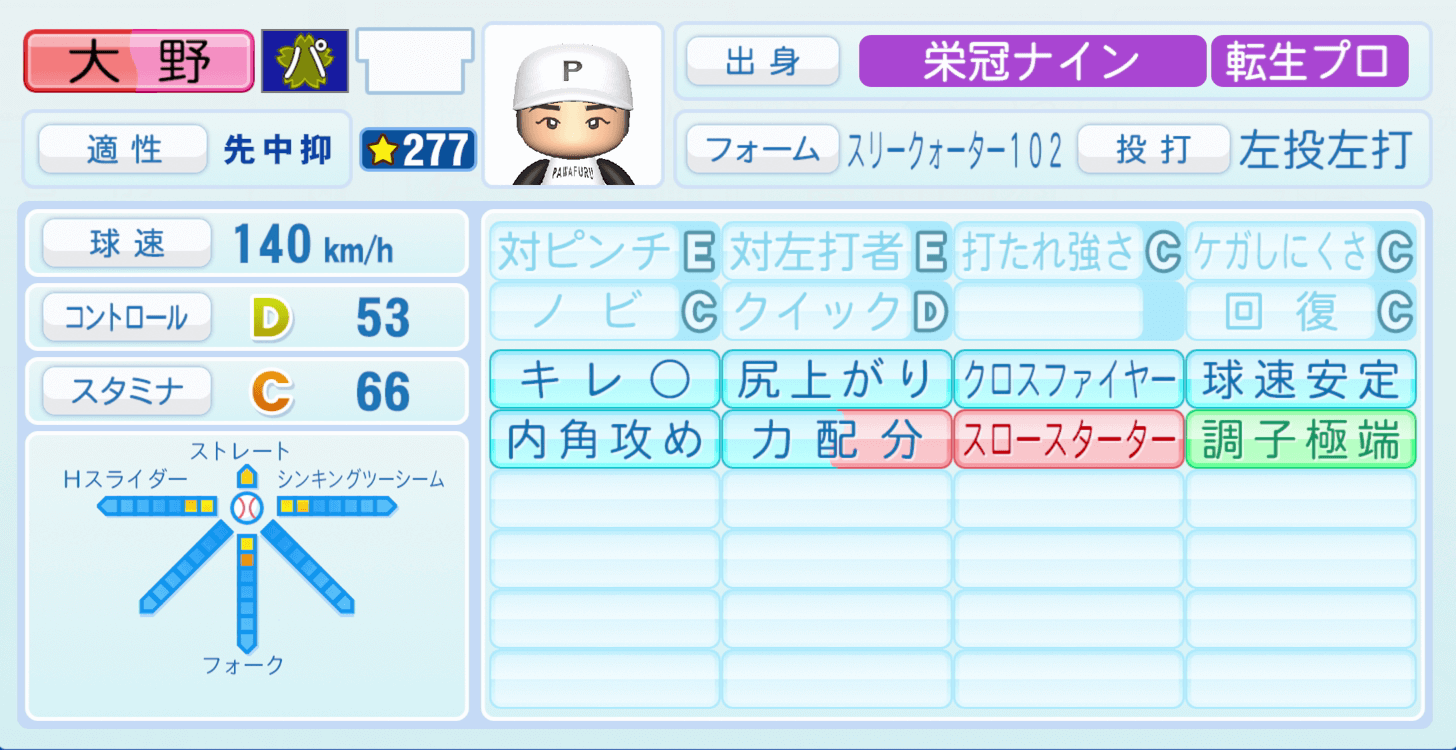| 適性 | 先/中 | 球速 | 152km/h |