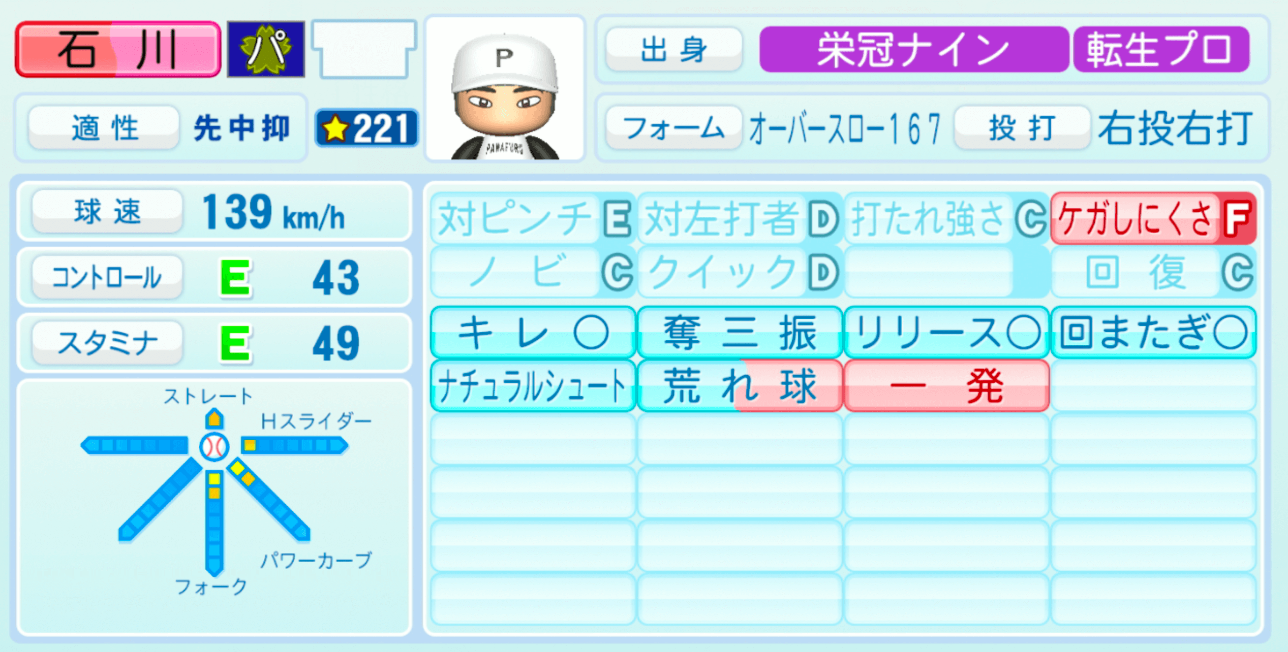 パワプロ2022における石川柊太(球団選手)の投手や野手能力、金特などの特殊能力を掲載。転生OBの年代や都道府県、入手方法についても解説しているので、パワプロ2022を攻略する際の参考にどうぞ。