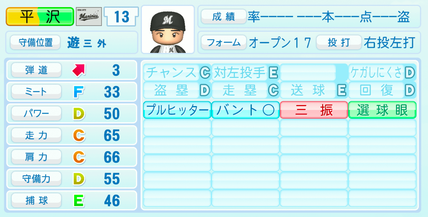 | 守備位置 | 弾道 | ミー | パワ | 走力 | 肩力 | 守備 | 捕球 |