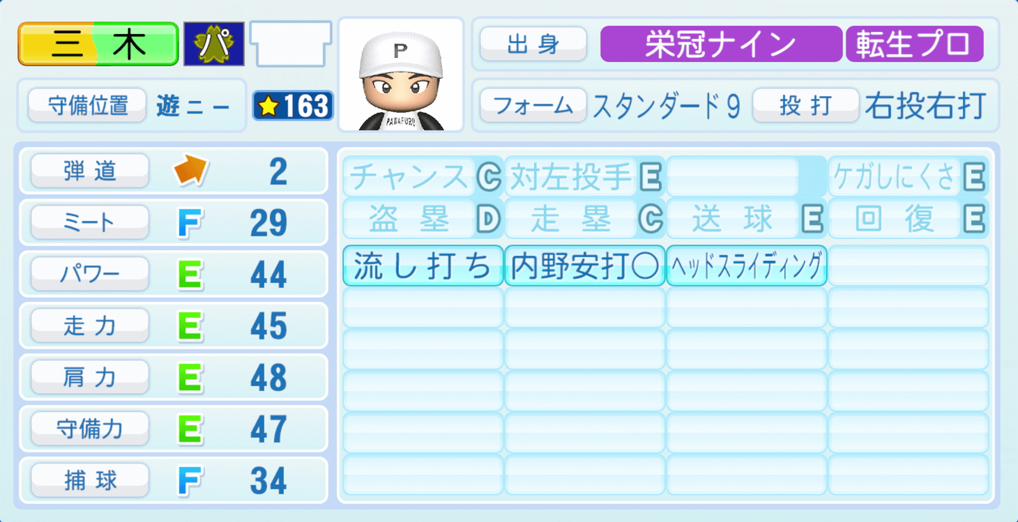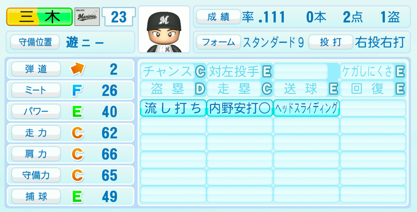 | 守備位置 | 弾道 | ミー | パワ | 走力 | 肩力 | 守備 | 捕球 |