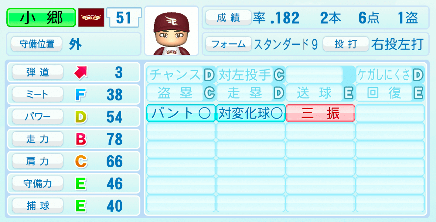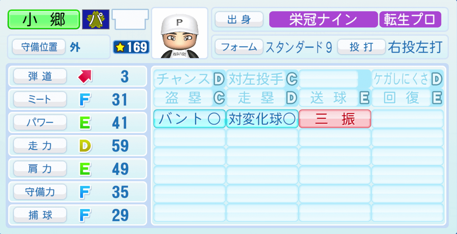 | 守備位置 | 弾道 | ミー | パワ | 走力 | 肩力 | 守備 | 捕球 |