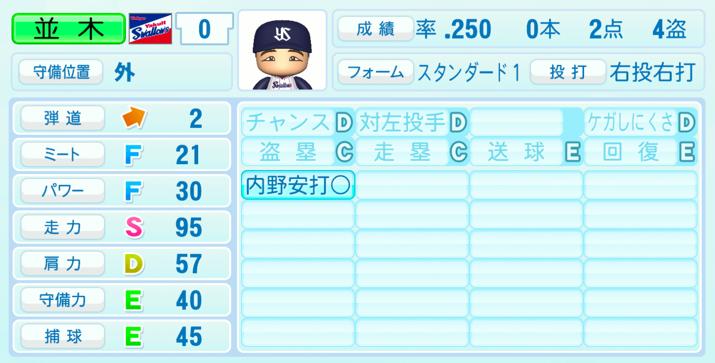 | 守備位置 | 弾道 | ミー | パワ | 走力 | 肩力 | 守備 | 捕球 |
