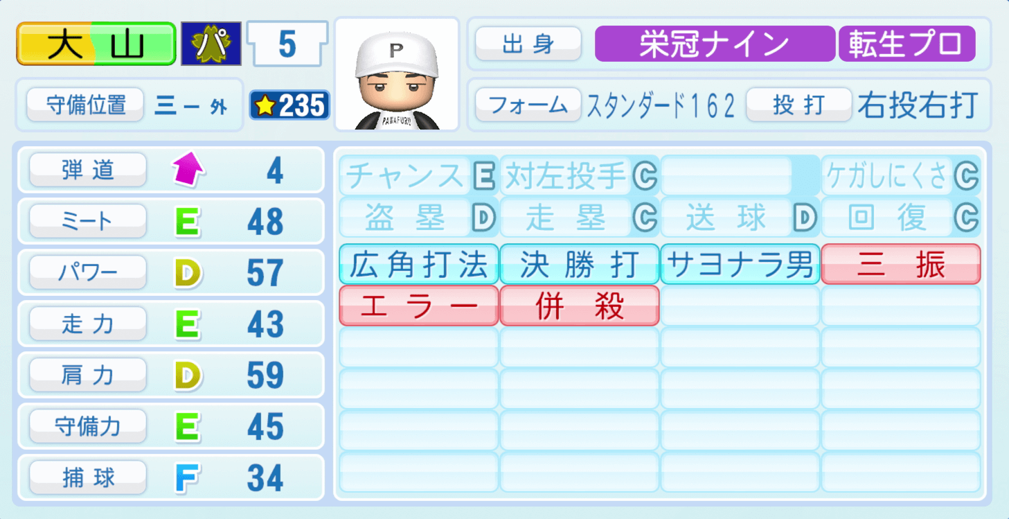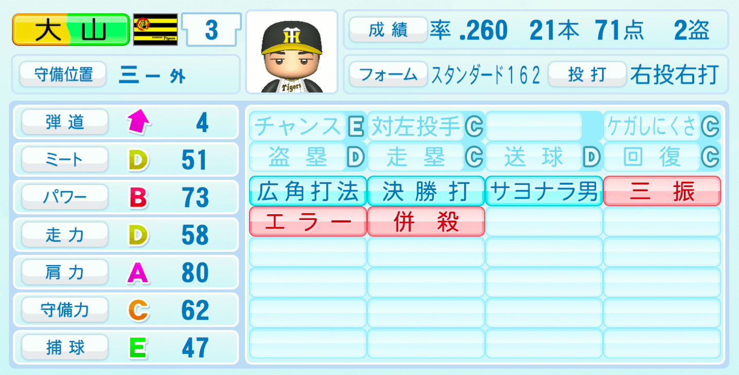 | 守備位置 | 弾道 | ミー | パワ | 走力 | 肩力 | 守備 | 捕球 |