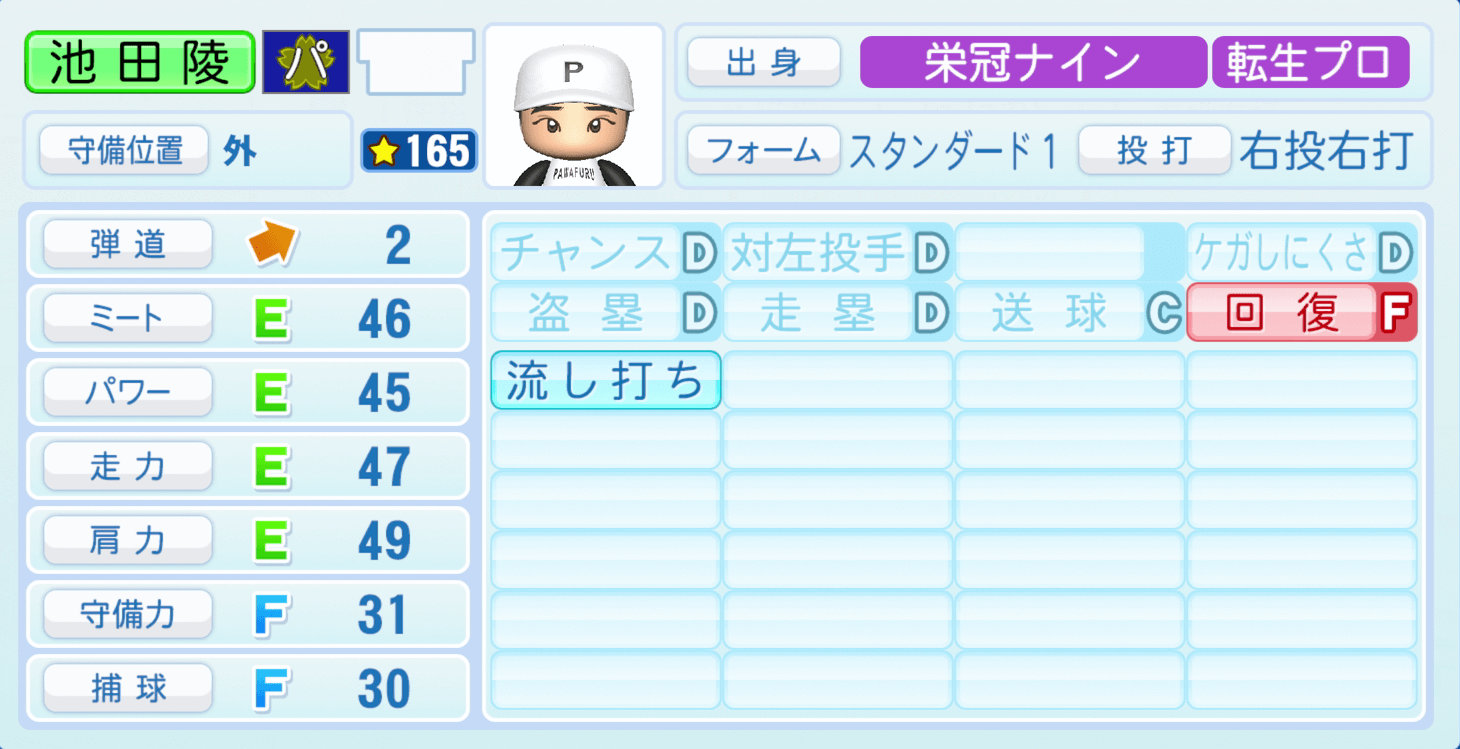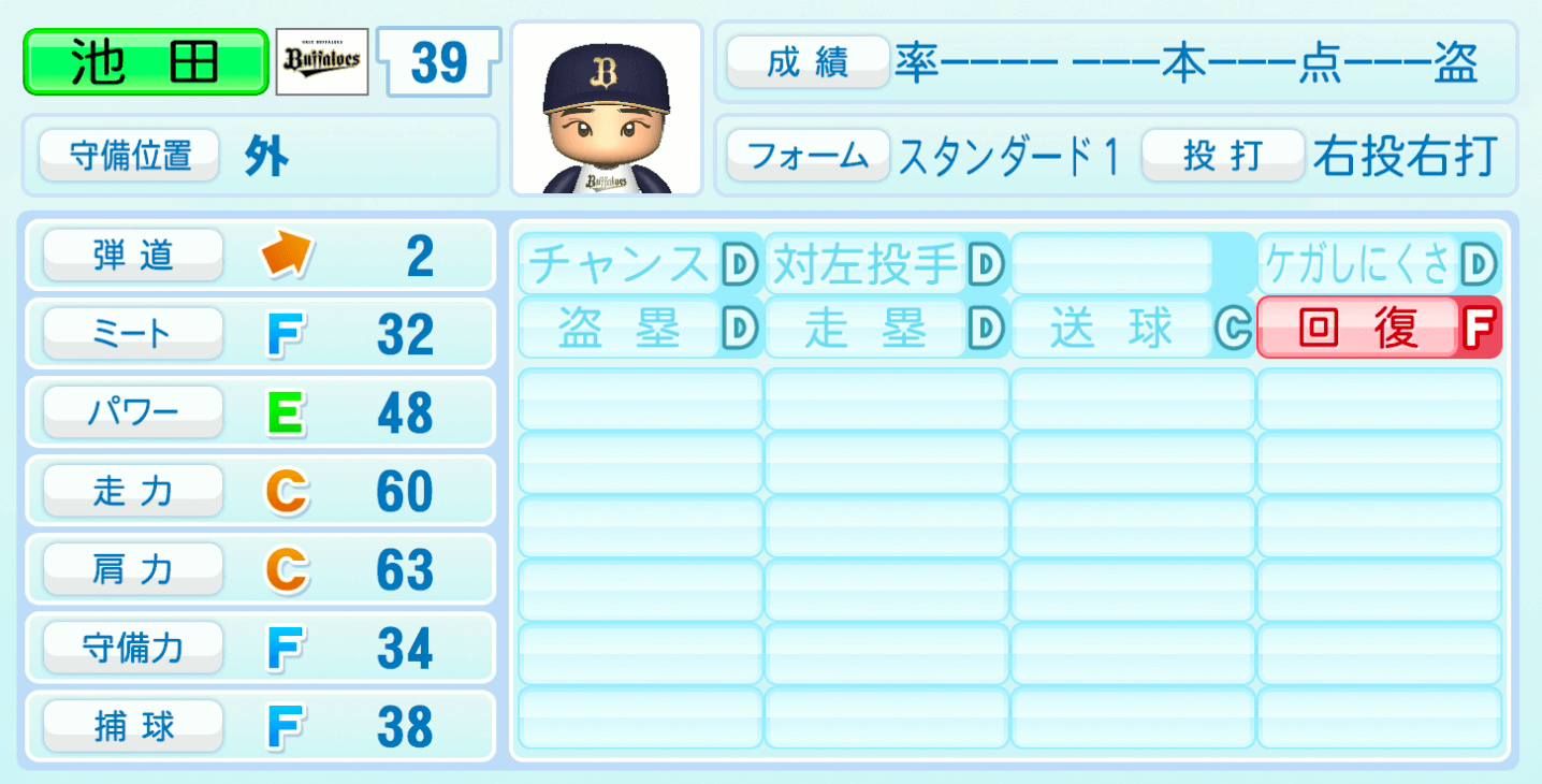 | 守備位置 | 弾道 | ミー | パワ | 走力 | 肩力 | 守備 | 捕球 |