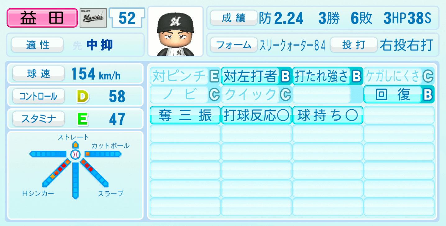 | 適性 | 中抑/- | 球速 | 154km/h |