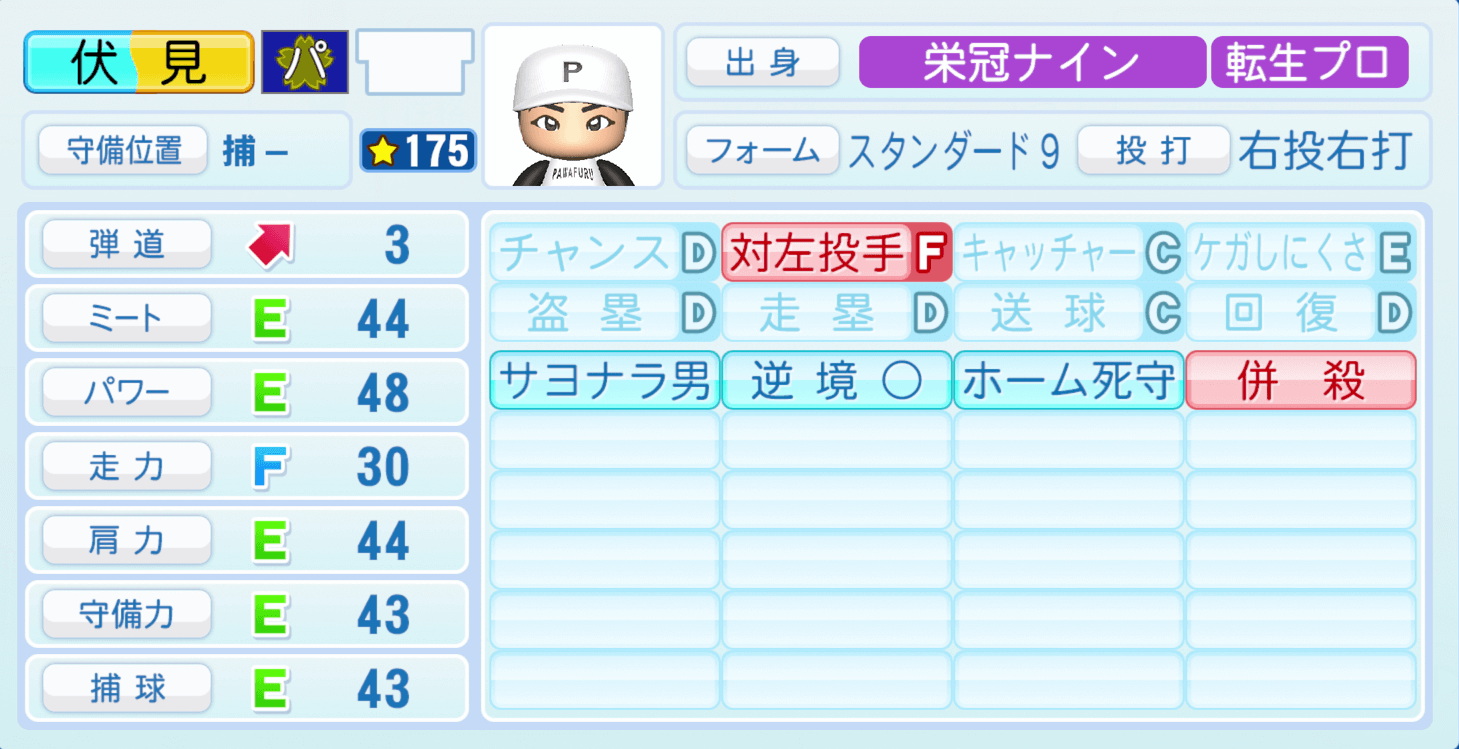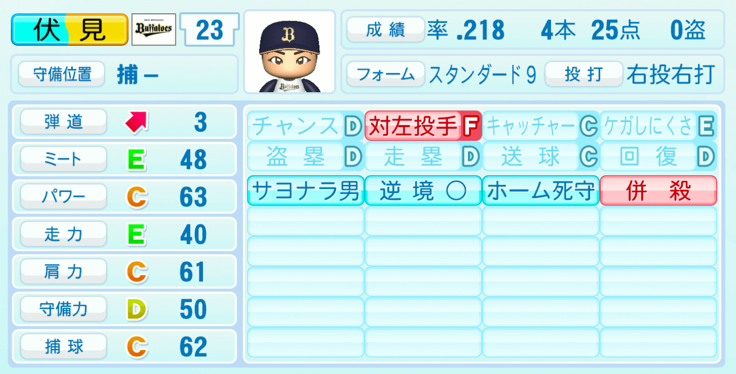 | 守備位置 | 弾道 | ミー | パワ | 走力 | 肩力 | 守備 | 捕球 |