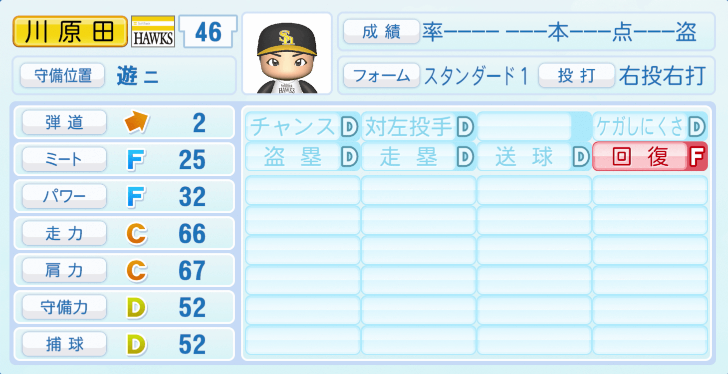 | 守備位置 | 弾道 | ミー | パワ | 走力 | 肩力 | 守備 | 捕球 |