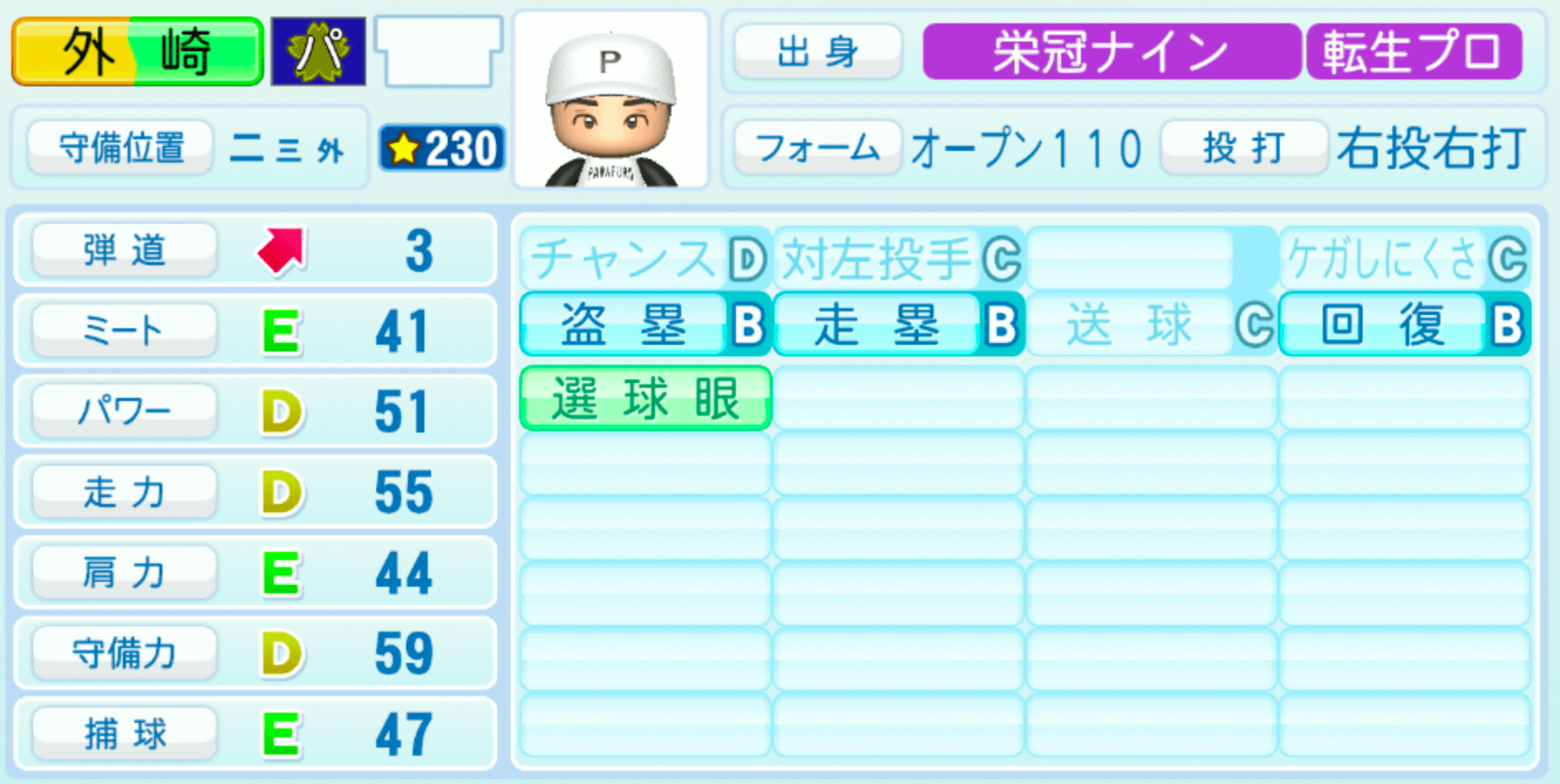 | 守備位置 | 弾道 | ミー | パワ | 走力 | 肩力 | 守備 | 捕球 |