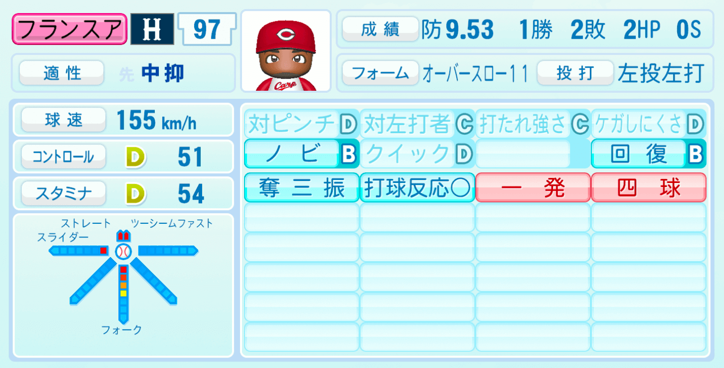 | 適性 | 中抑/- | 球速 | 155km/h |