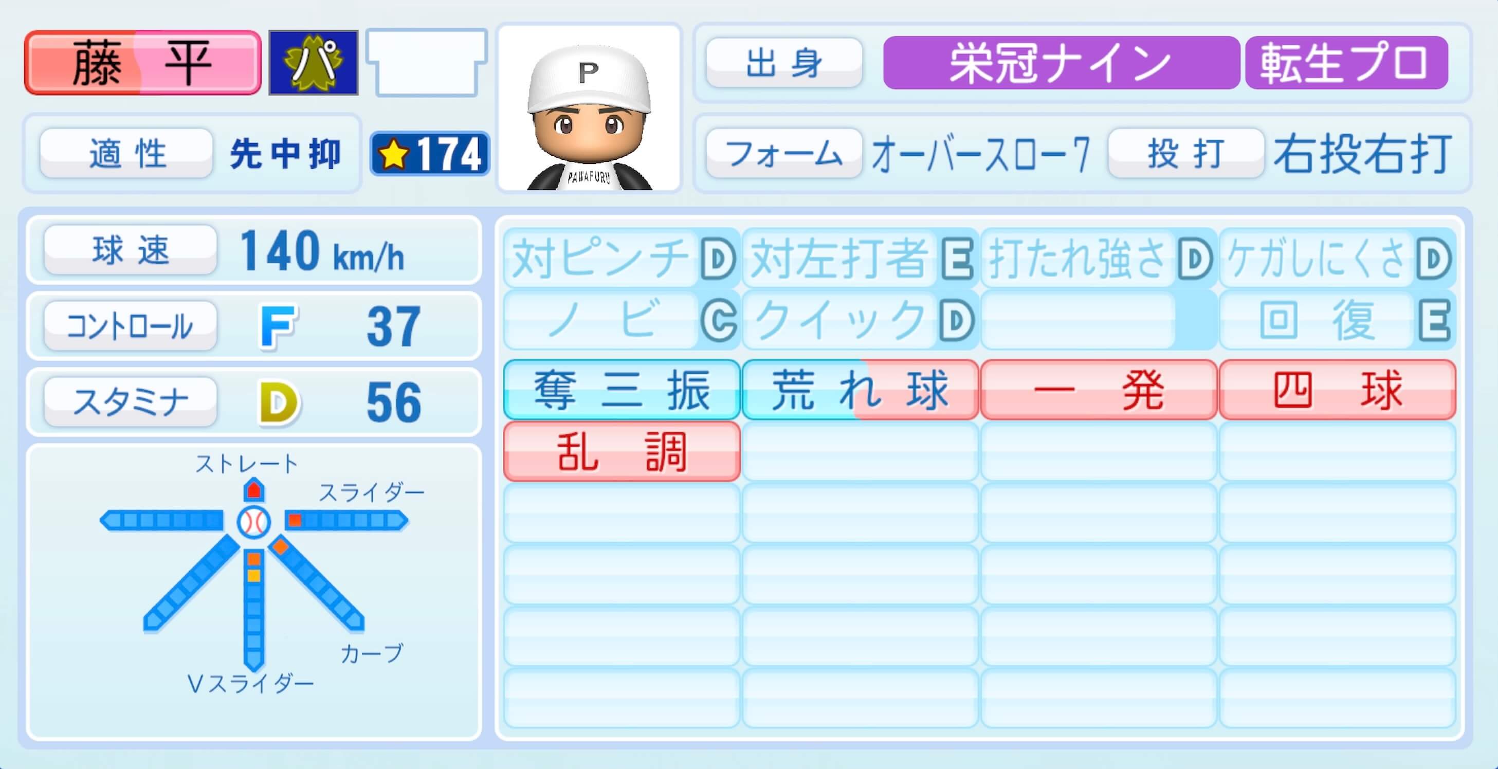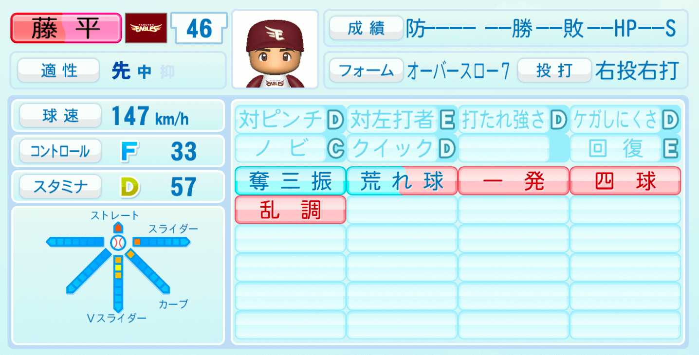 | 適性 | 先/中 | 球速 | 147km/h |
