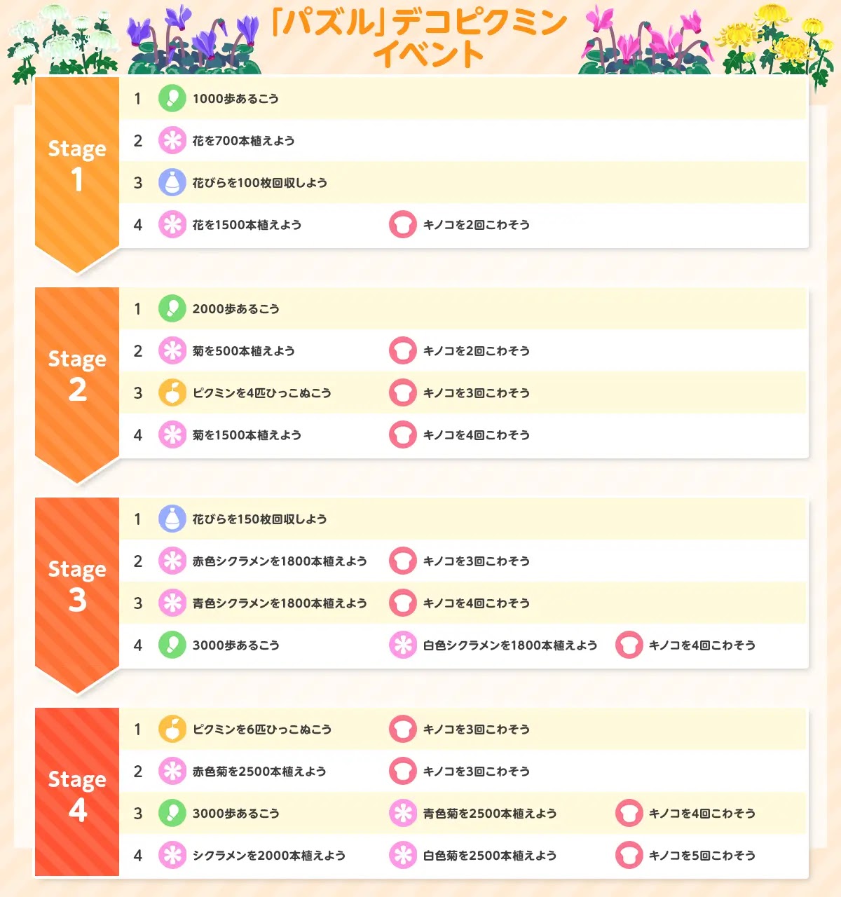 | お題3-4 | ・3000歩あるこう ・白色シクラメンを1800本植えよう ・キノコを4回こわそう |
