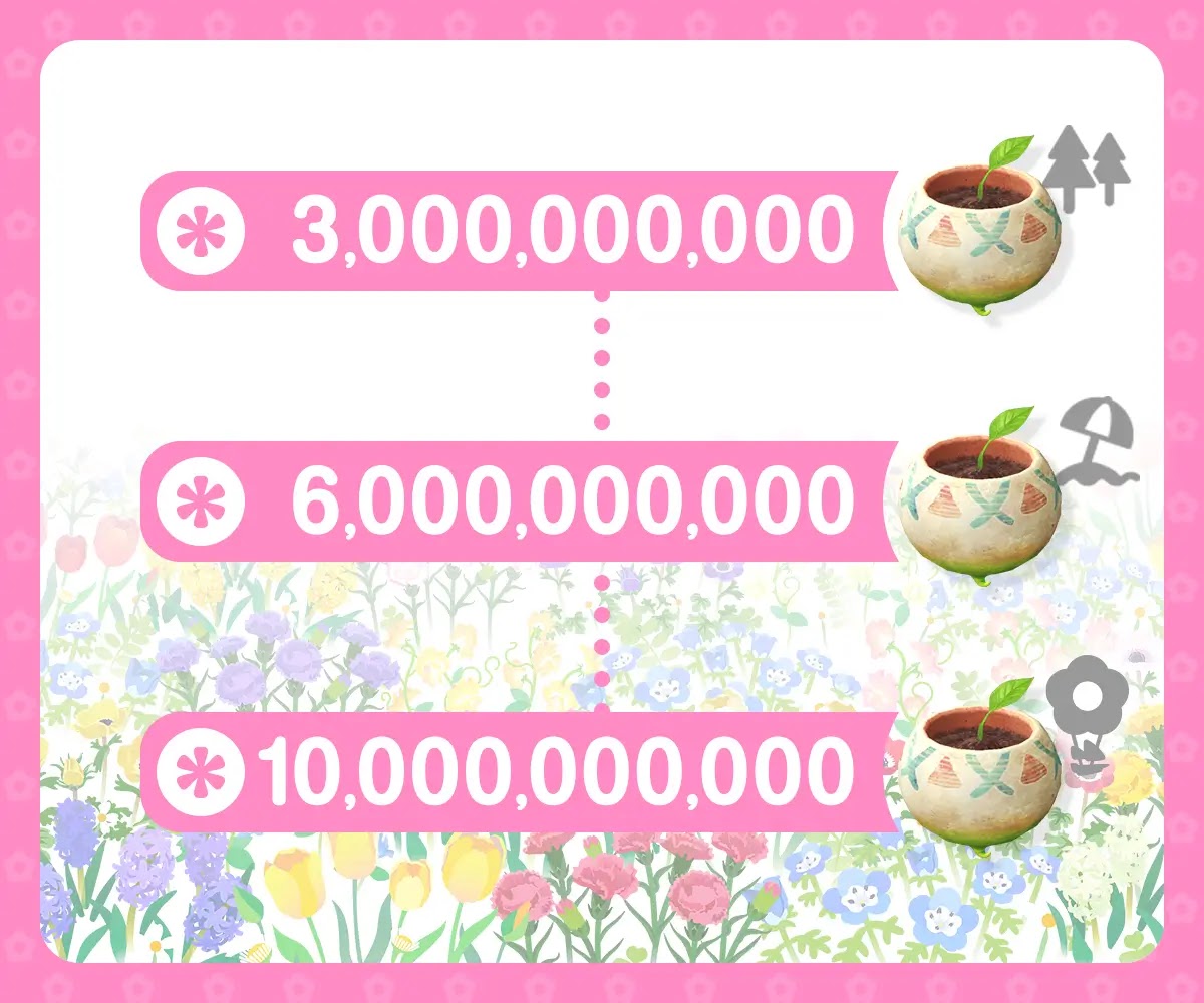 目標花植え本数を達成すると、天候に関連したデコピクミンの大きな苗を獲得可能だ。また、花植え合計が15億本に到達すると、イベント限定の「金のプレゼントシール」デコピクミンを獲得できる。