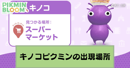 キノコデコピクミンの苗はスーパーマーケット周辺で獲得可能だ。そのため、入手難易度は比較的低く見つけやすい。ただし、スーパーマーケットカテゴリの苗はバナナデコピクミンになることもあるため、ピクミンの入手難易度は少しだけ上がる。