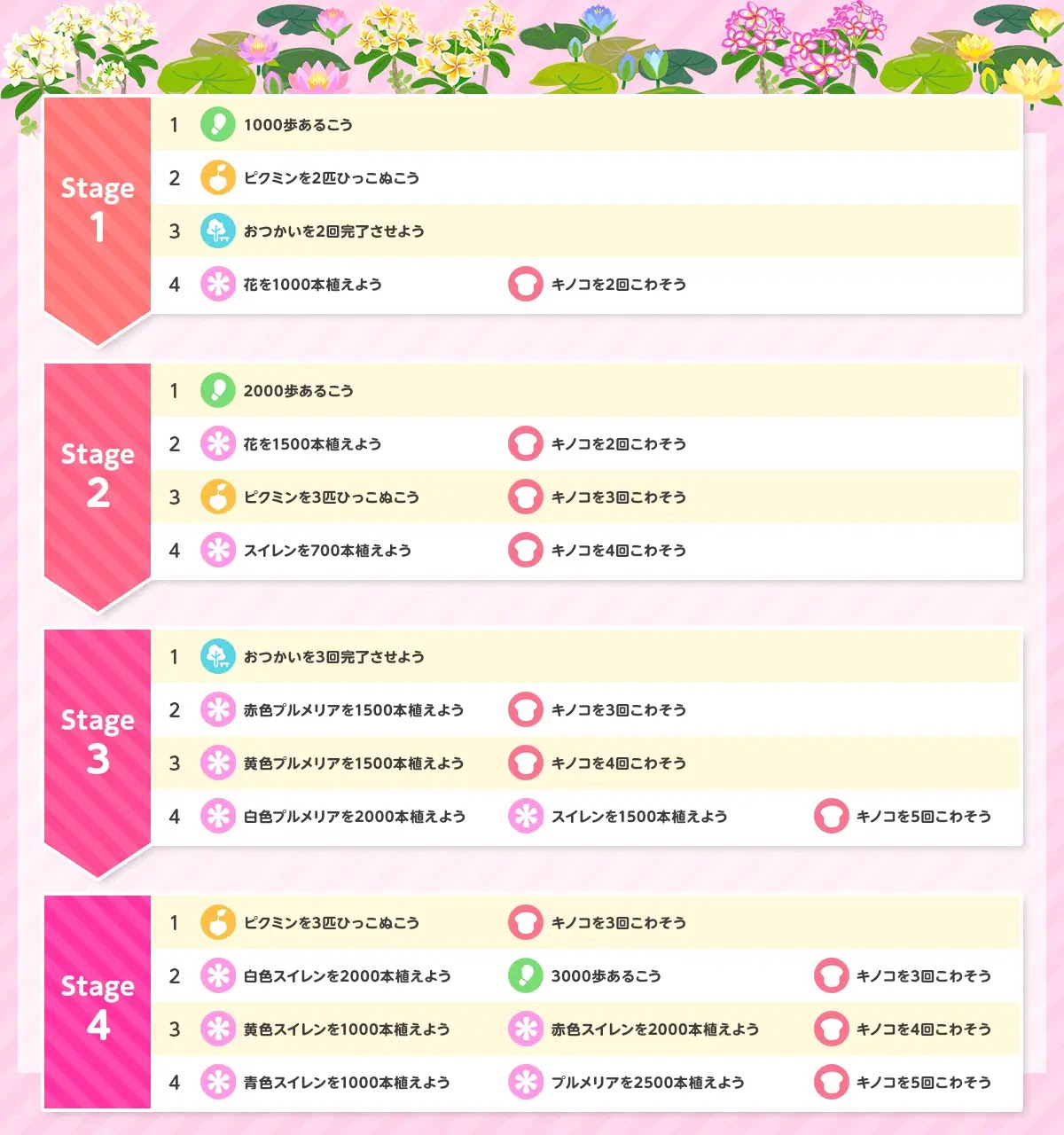 イベントチャレンジは、お題を順番にクリアする必要があるイベントだ。お題をクリアするたびにルーレットに挑戦でき、花びらやエキス、金の苗などがランダムでもらえる。また、お題を4つクリアするたびに、確定で金の苗を獲得可能だ。