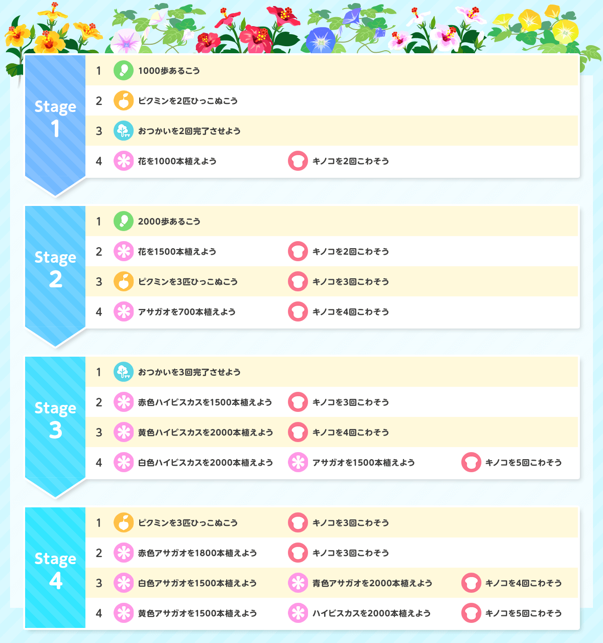 | お題4-4 | ・黄色アサガオを1500本植えよう ・ハイビスカスを2000本植えよう ・キノコを5回こわそう |