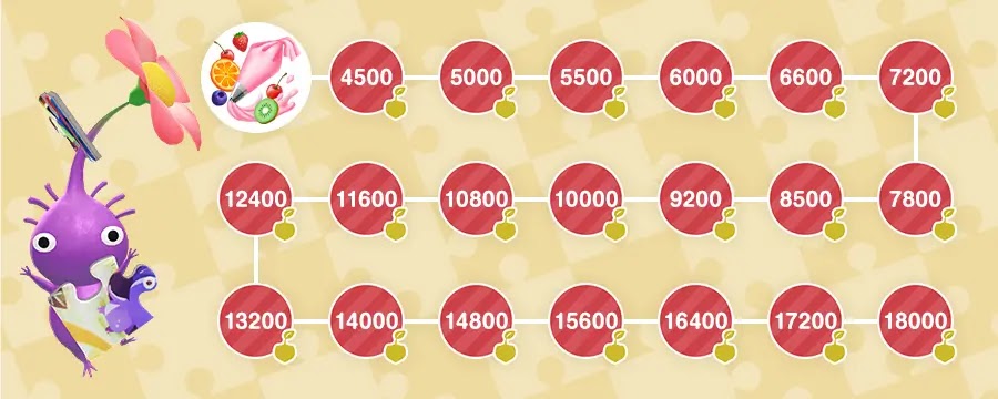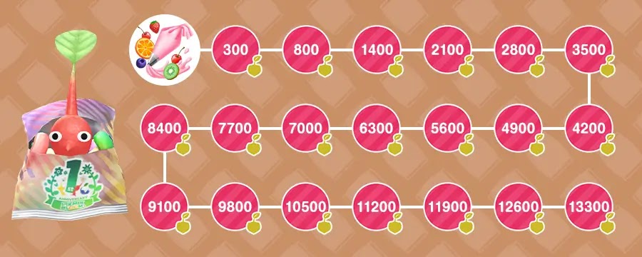 イベントチャレンジのお題をクリアするたびに花びら、「スイートホイップ」、「3周年カップケーキ」デコピクミンの苗などがランダムで獲得できる。また、ステージの真ん中にあるビッグフラワーが咲く際に、追加の報酬として確定で金の苗を獲得可能だ。