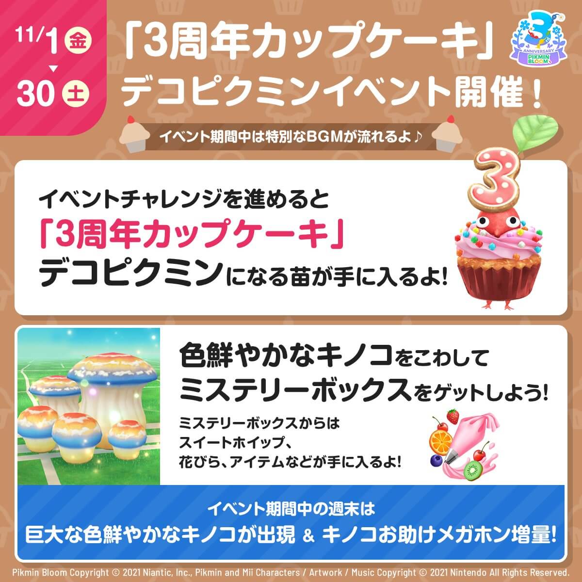 イベント期間中、「3周年カップケーキ」、「1周年記念のお菓子」、「パズル:2021年秋の思い出」は、キノコに対するおしごと力がアップする。3種のデコピクミンを獲得したら優先してキノコに派遣しよう。