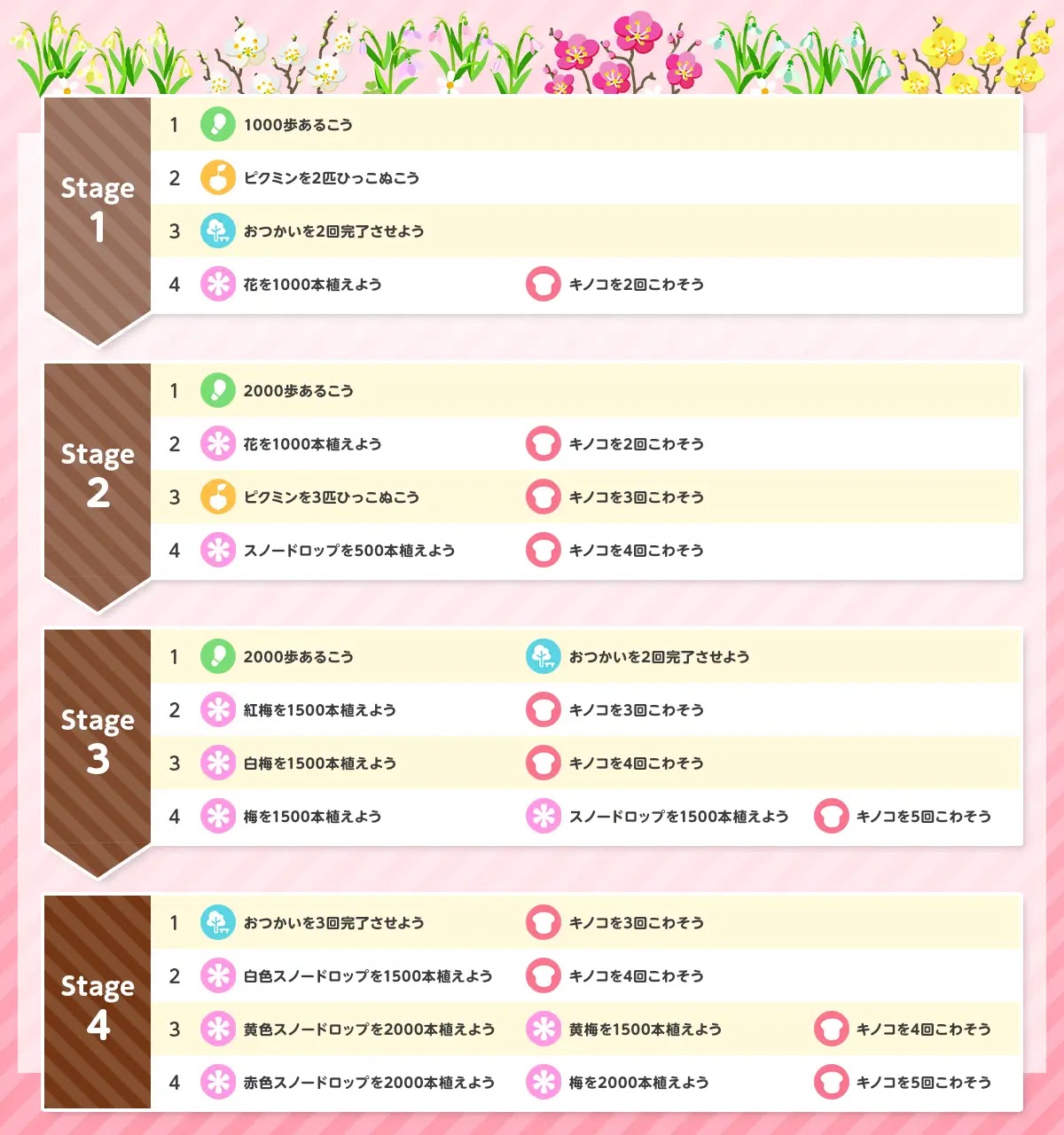 | お題4-3 | ・黄色スノードロップを2000本植えよう ・黄色梅を1000本植えよう ・キノコを4回こわそう |