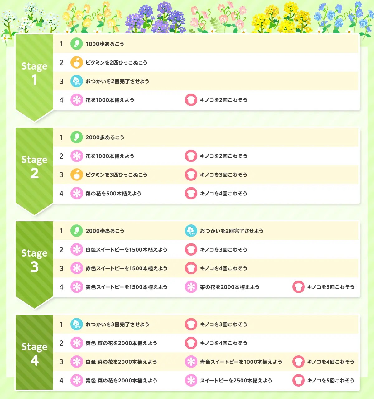 | お題3-4 | ・黄色スイートピーを1500本植えよう ・菜の花を2000本植えよう ・キノコを5回こわそう |