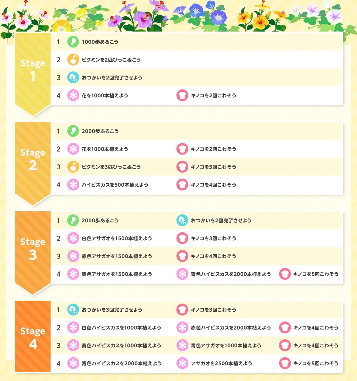 | 4-3 | ・黄色ハイビスカスを1000本植えよう ・青色アサガオを1000本植えよう ・キノコを4回こわそう |