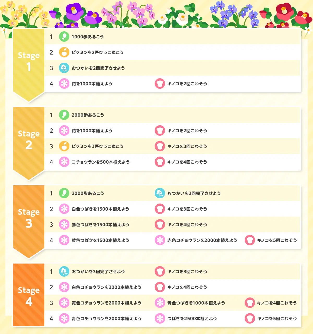 | 4-3 | ・黄色コチョウランを2000本植えよう ・青色つばきを1000本植えよう ・キノコを4回こわそう |