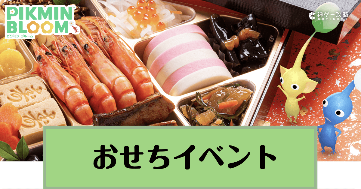 Pikmin Bloom(ピクミンブルーム)のおせちイベントのお題とデコピクミン一覧を紹介!仕様や購入可能なお題付きチケット、おせちピクミンについても記載しているので、おせちイベントに参加したい方は参考にどうぞ!