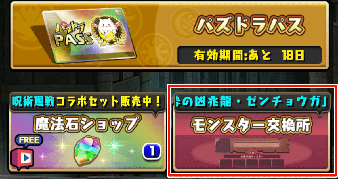 モンスター交換所は、ページ下部メニューにある「ショップ」から選択できる。ショップ画面では「パズドラパス」の右下にある「モンスター交換所」をタップしよう。