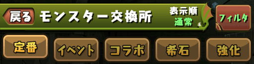 交換所は「定番」「イベント」「コラボ」「希石」「強化」の5種類あり、交換できるモンスターが決まっている。交換する目的のモンスターによって種類を選択しよう。