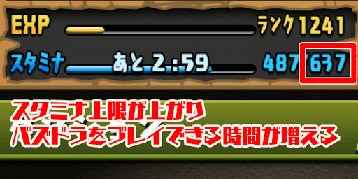 ランクを上げるとスタミナの上限が増える。スタミナ上限が増えると挑戦できるダンジョンが増加したり、魔法石1個あたりのスタミナ回復効率が上昇したり等のメリットがある。