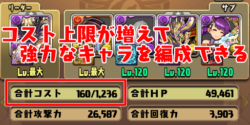 ランクが上昇するたびにパーティの編成枠数が増えたり、コスト上限が上昇したりする。様々な種類のパーティを一度に保存でき、より強力なパーティが組めるようになる。