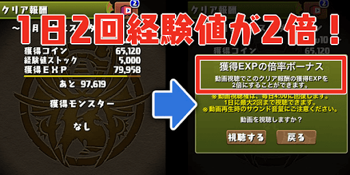 ダンジョンクリア後に広告動画を視聴すると、獲得ランク経験値を2倍にできる。1日2回のみしかできないが、1度に大量の経験値を獲得できるため、効率的にランク上げを行える。