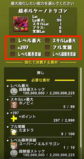 最大強化とは、モンスターを一括で強化できる機能だ。レベルやスキルレベル、+297、覚醒、限界突破などの複数の強化項目を一括で強化できる。