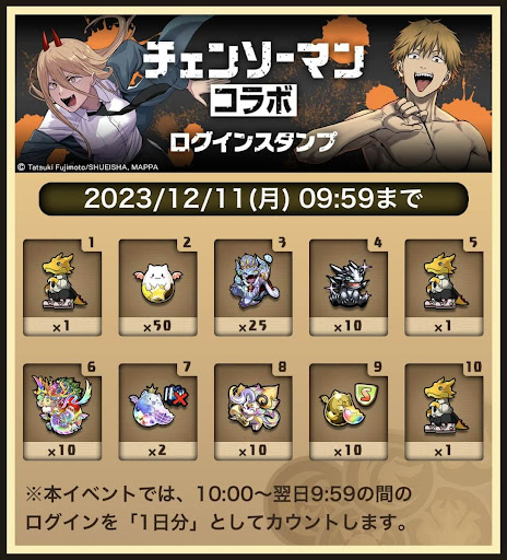 ログインするだけで豪華報酬がもらえるログインスタンプが実施される。10日目のログインスタンプ報酬では、チェンソーマンコラボキャラのみが的中するガチャがもらえる。