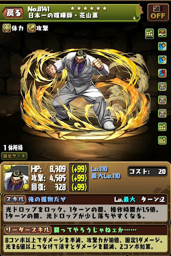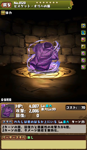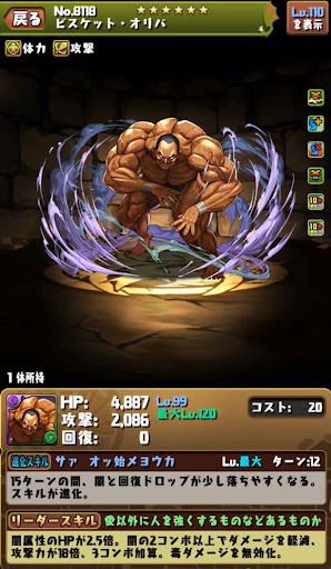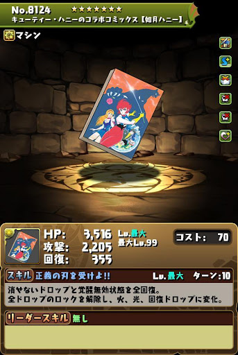 【進化前】 ・攻撃21倍+回復3倍+半減+2秒延長LS ・攻略リーダーとしては微妙 ・光ドロ強5個で火力を底上げ【究極進化】 ・HP2.8倍+攻撃22.4倍+覚醒無効全回復LS ・無効貫通+コンボ強化で火力発揮 ・ロック解除+3色陣+全ドロ強スキルが優秀 ・スキブ4個と暗闇耐性+持ち【アシスト進化】 |